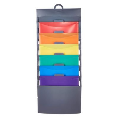 - Binder with 6 interconnected pockets that cascade down when hung; multi-color; saves space and helps keep work areas organized