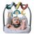 - A soft moon toy includes a dangling mirror to reflect light and capture baby’s interest